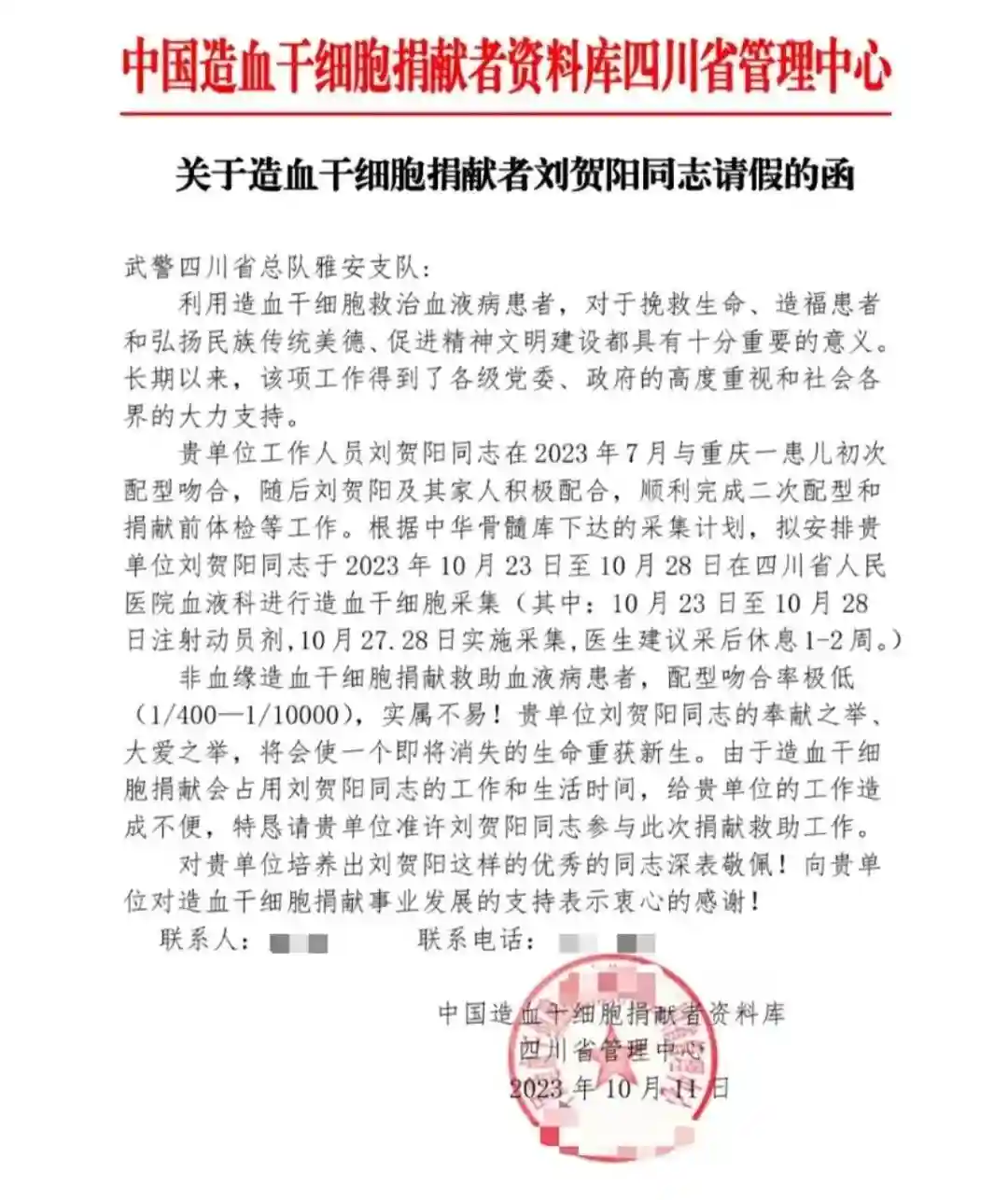 刘贺阳成功捐献造血干细胞