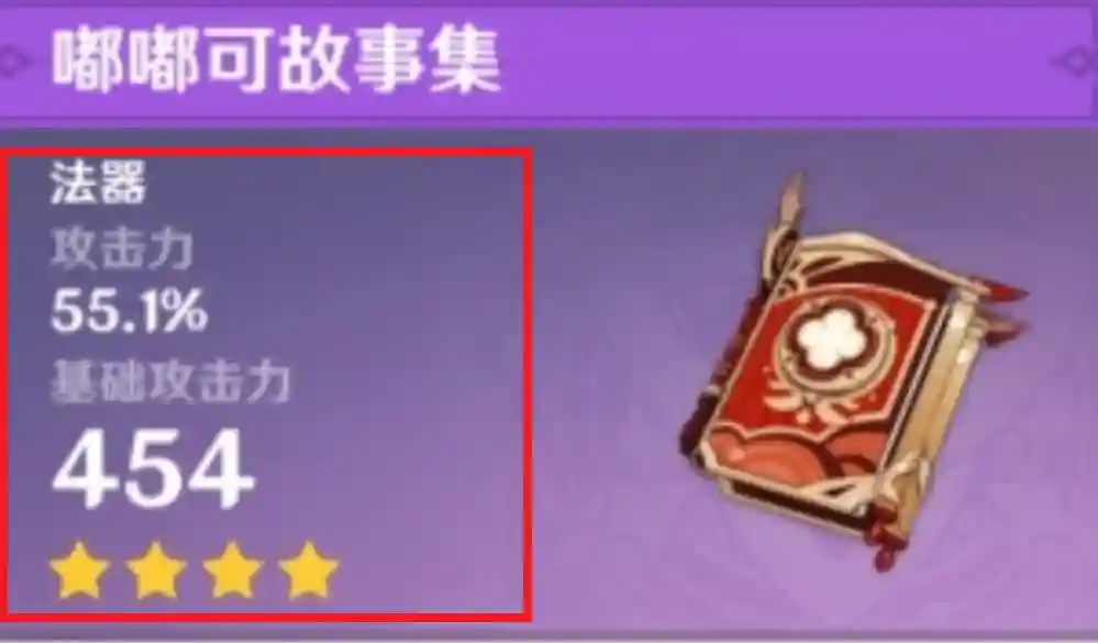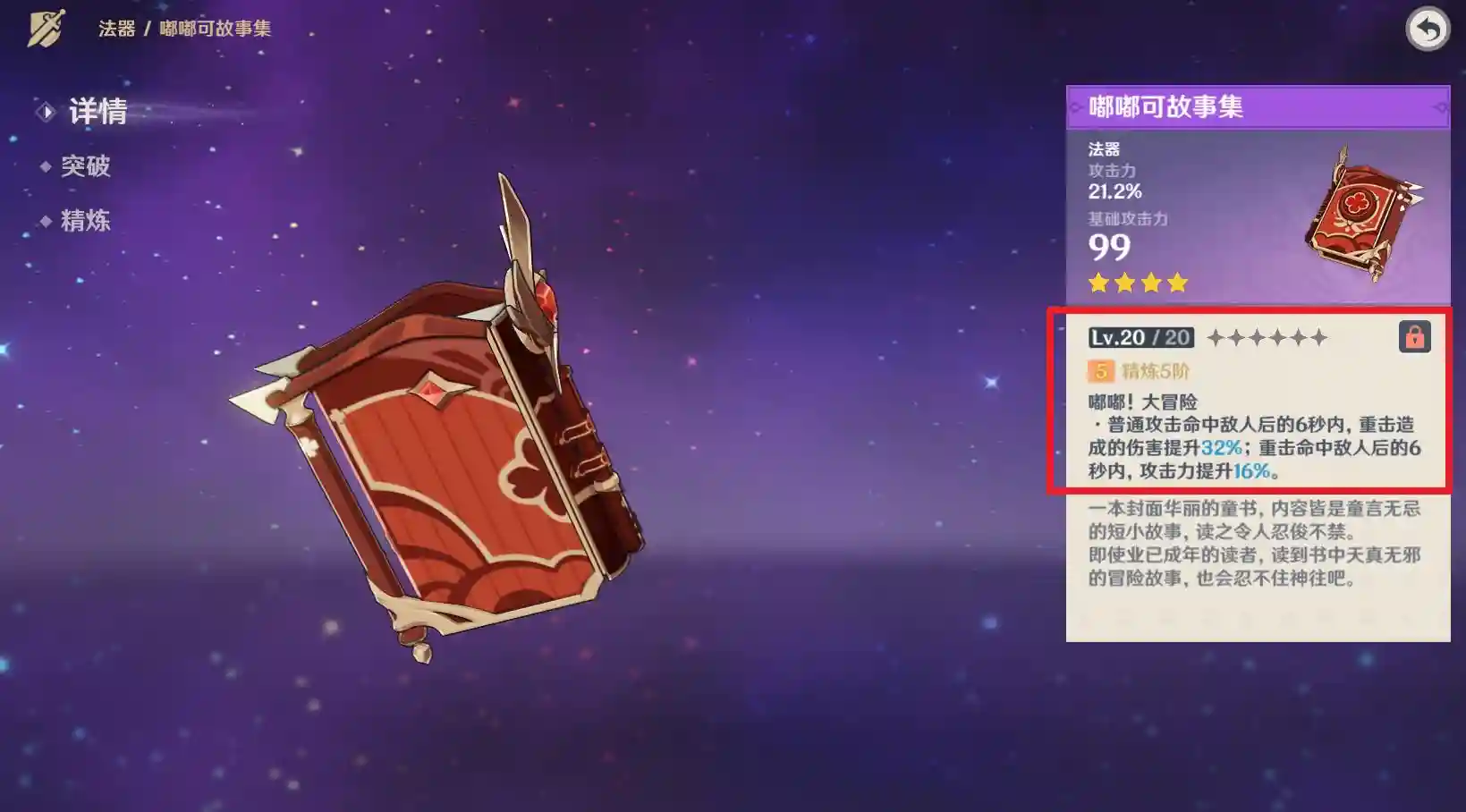 在之前,玩家们一直都认为这会是一件“通用型”的法器,也就是不管4星还是5星的角色,都能使用这件武器,且能带来不错的伤害收益。主要原因还是由于嘟嘟可故事集的基础属性,主词条是增加攻击力基础的,被动效果为提升重击伤害(32%)和攻击力(16%)。而目前来说,基本上所有的法器类角色,都是依赖普攻和重击来打伤害的,这样的属性被看好也无可厚非。