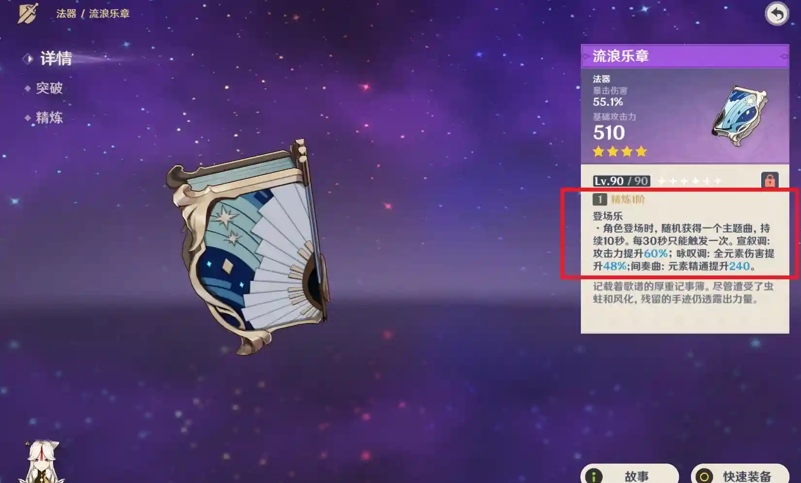 当我们将嘟嘟可故事集拉满90之后,你就会发现一个问题,它的白值攻击力为454点,增加攻击力为55.1%。而同等级的4星法器“万国诸海图谱”为565点,“流浪乐章”为510点,虽然嘟嘟可故事集有55.1%的攻击力增幅相互补偿,但总体算下来还是要低于万国和流浪的。因为不管怎么说,嘟嘟可都要输一项词条,万国增加110元素精通,流浪增加55.1%暴击伤害。