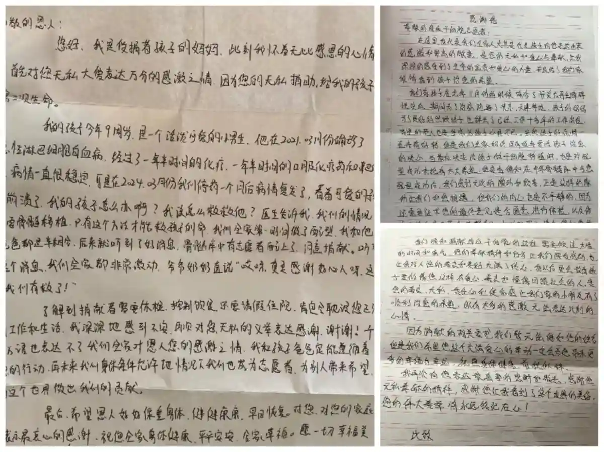 “对您的无私大爱表达万分的感激之情,因为您的无私捐助,给我的孩子第二次生命。”“是您的善良、无私、责任心和使命感,让我们家的小朋友有了顺利治愈的希望,纵有太多的感激无法表达此刻的心情……感谢您让我看到了这个世界的美好。”两位孩子的家长特意写了感谢信,表达对好心人大爱善举的敬意和感恩。