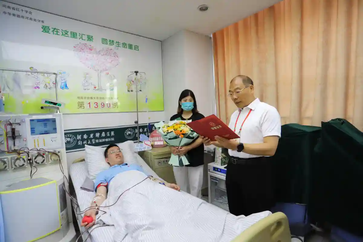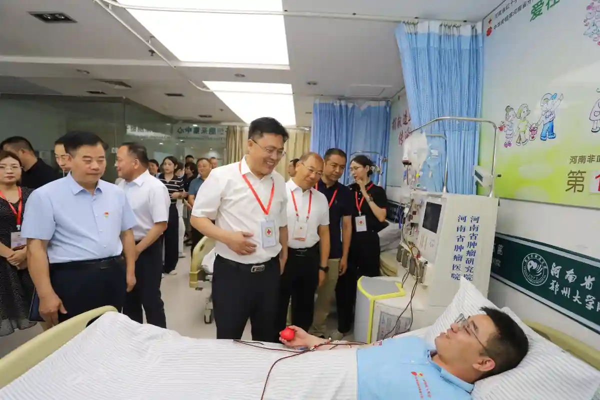 在武昊、杨艺习捐献期间,河南省红十字会党组书记、常务副会长秦高亭,河南省肿瘤医院党组书记伊文刚,郑州市红十字会党组书记、常务副会长孙玄等前往采集室看望、慰问两名捐献者,为他们加油点赞。
