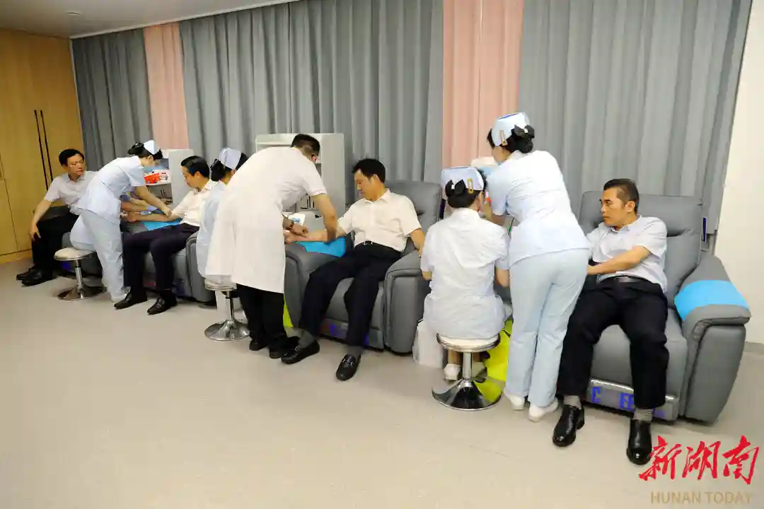 血压检测、验血、献血……当日上午,在岳阳市中心血站工作人员的引导下,李挚一行与其他参与献血的市民,填写好登记表、录入个人信息等准备工作后,井然有序地排起队,挽起衣袖捐献出自己的一份热血。