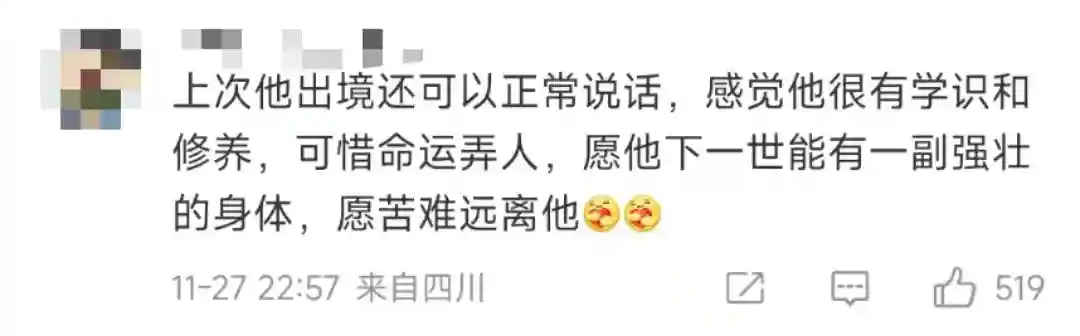 今年1月,蔡磊谈及自己的身体情况时称,从起床到卫生间5米的距离都需要有人扶着,吞咽、咳痰情况也变差,现在呼吸也已经开始衰竭,必须整夜戴呼吸机,身体肌能全面下滑,直言“离死亡已经非常近了”。