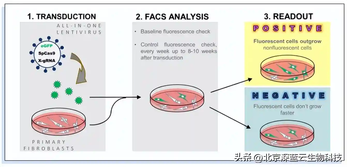 3、通过定量转导细胞生长优势指标来判断基因组编辑的影响,阳性结果中荧光细胞占绝对优势,阴性结果中荧光细胞不存在生长优势。