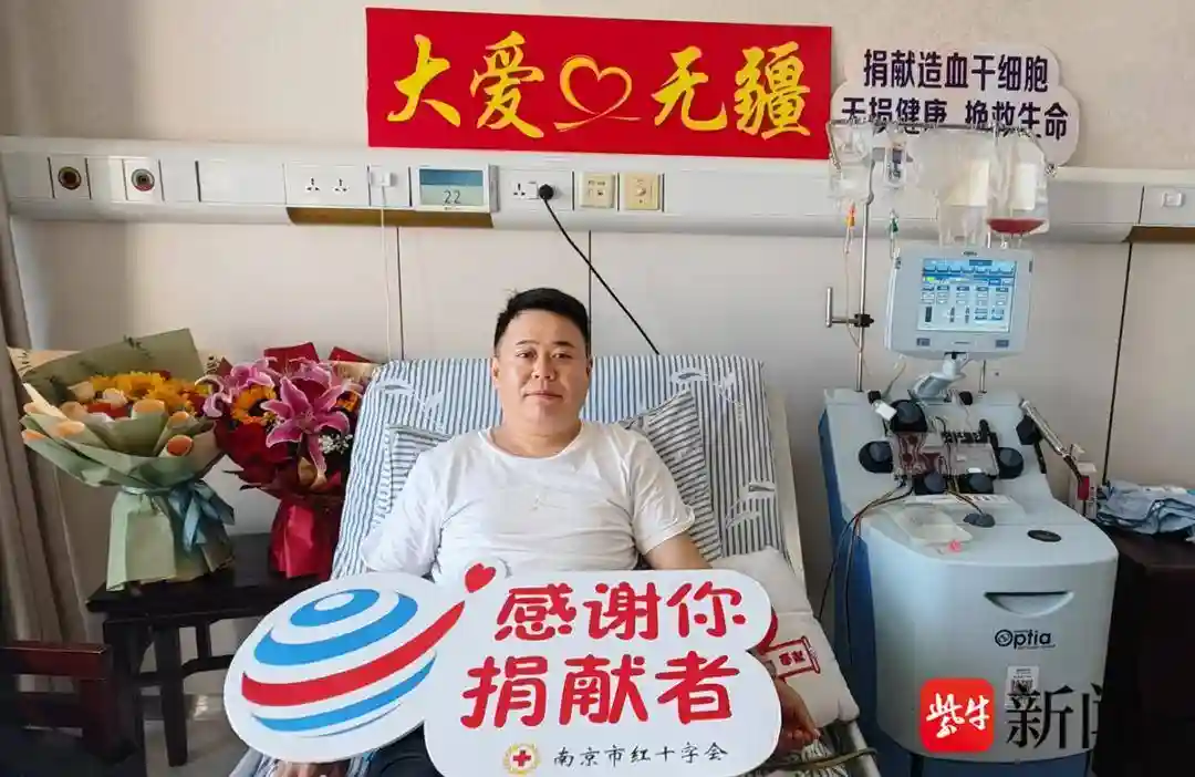 2023年11月1日上午,在东南大学附属中大医院,来自江宁区横溪街道西岗社区的工作人员周浩正在进行造血干细胞采集。他是江苏省第1272位、南京市第168位、江宁区第21位造血干细胞捐献者。