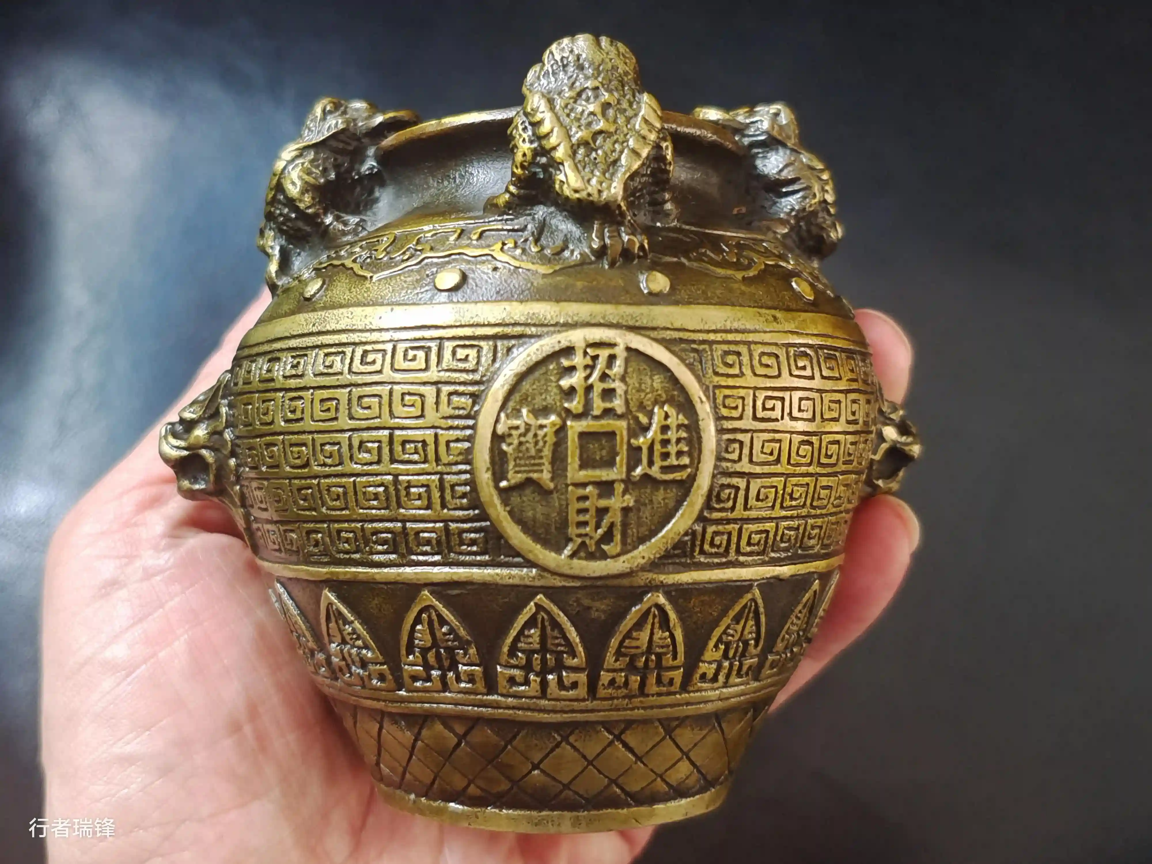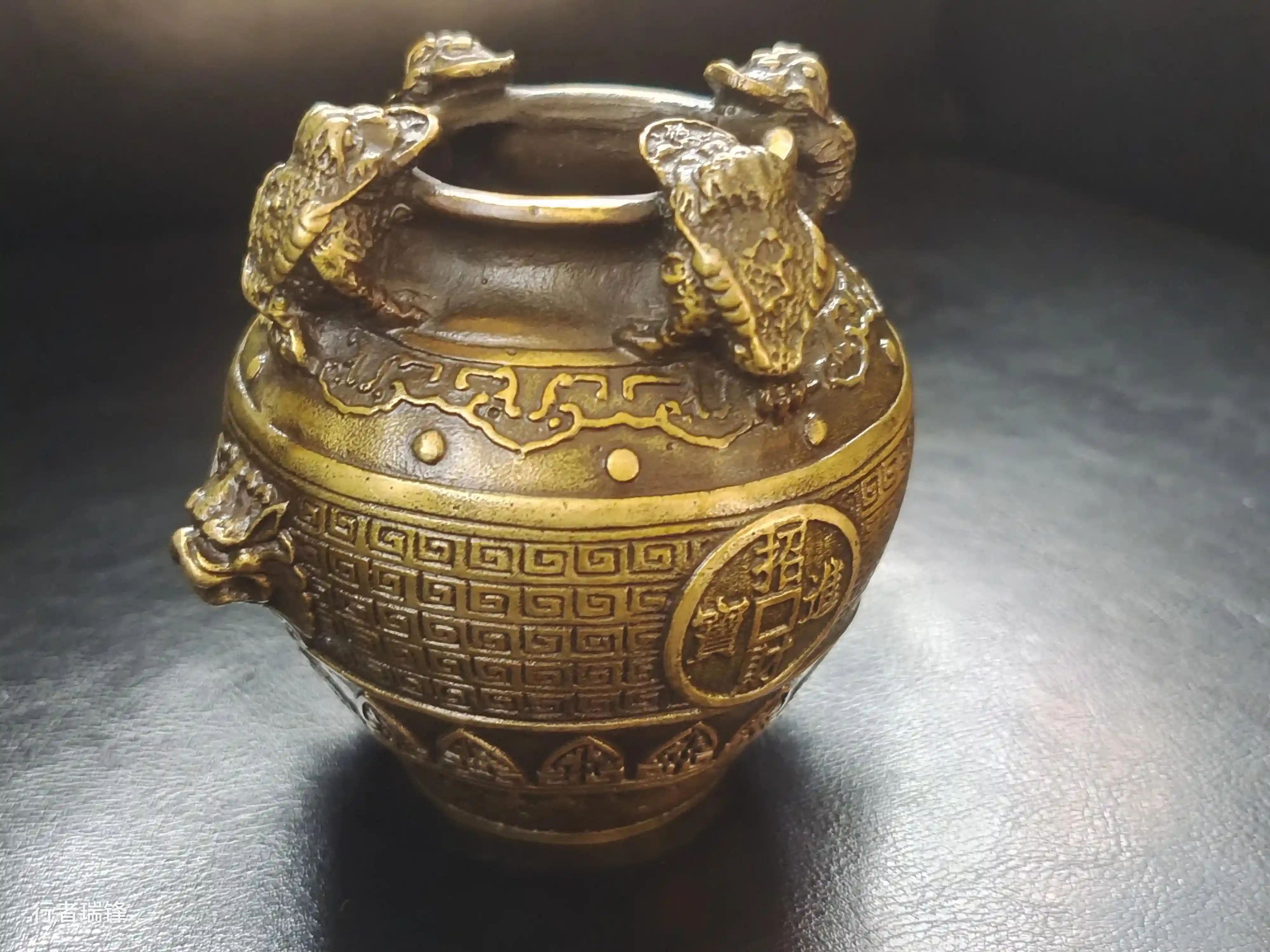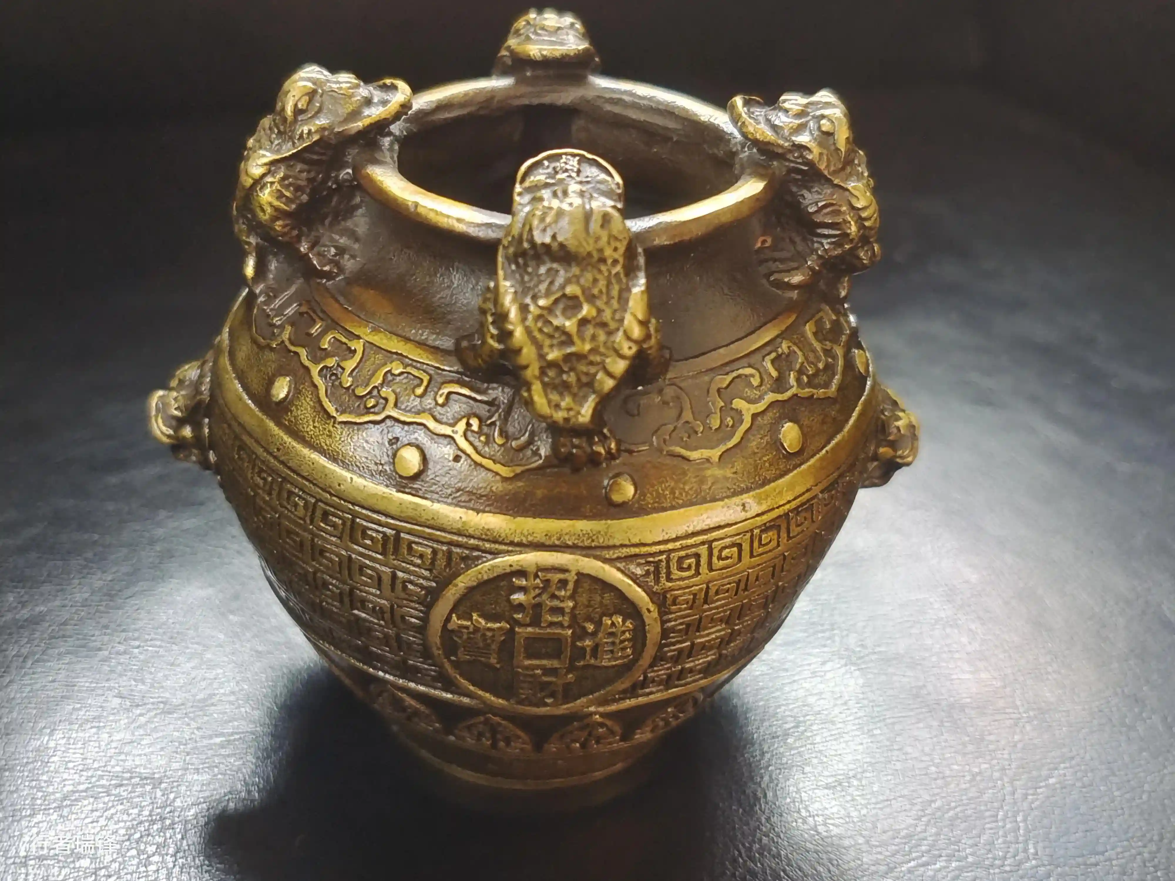金蟾皈依正道后,受命吐出金银财宝,接济苦难,造福世人,因此也被奉为了招财的神物。这只铜炉为缸型,五层纹饰,最上层纹饰为等距对称分布,趴伏在口沿的四只金蟾,金蟾背布北斗七星,口衔铜钱,体型匀称灵动,做吐铜钱状。金蟾欲吐铜钱上各微雕一字,右旋读依稀可辨为“招财进宝”四字。