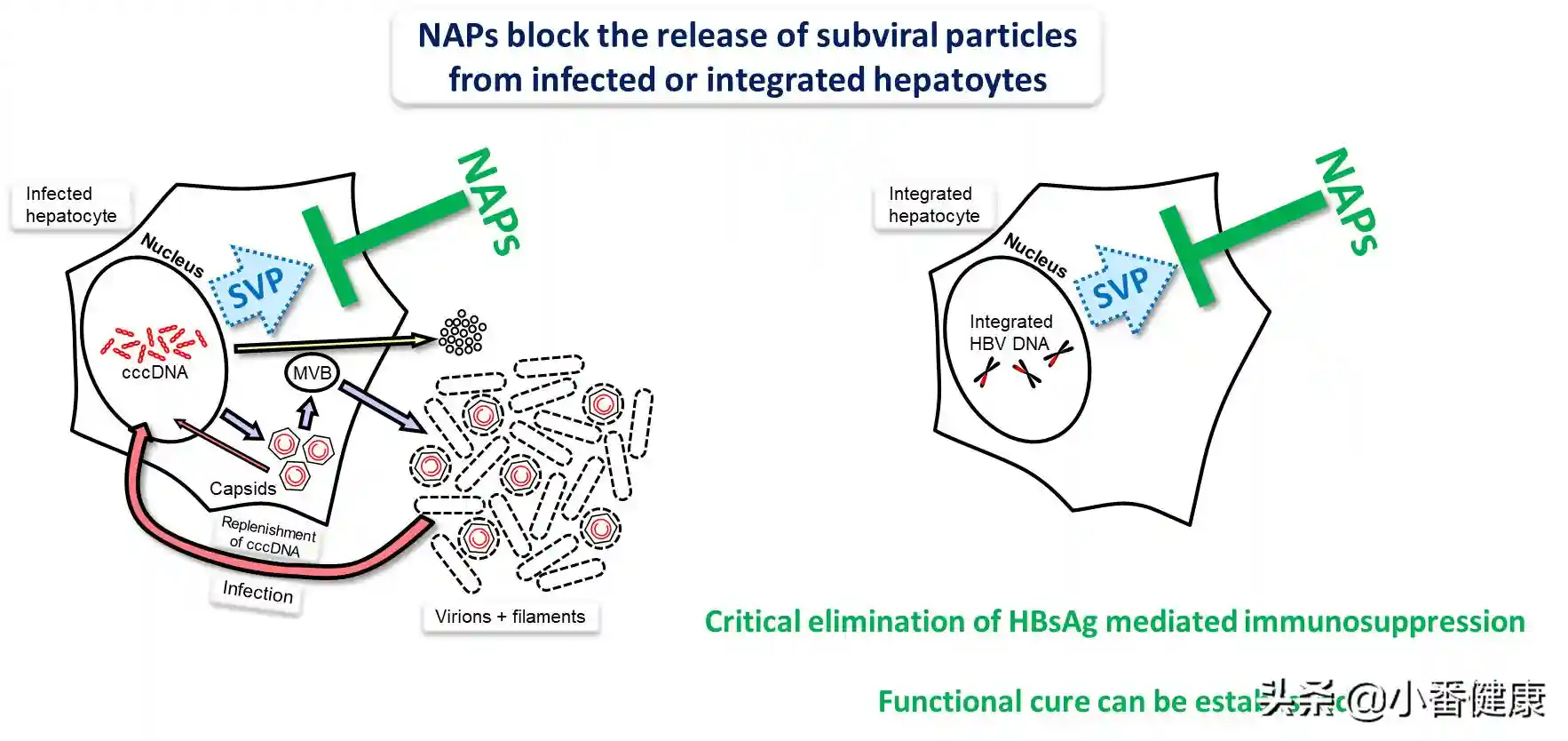伴随研究人员随访结束后,观察到18名功能性治愈中,0位可测得所有乙肝表面抗原亚型;19名病毒学抑制患者中,17位可测得所有乙肝表面抗原亚型;15名病毒学反弹患者中,全部15名检测到所有乙肝表面抗原亚型(S/Co1)。综合2020年美国肝病研究学会年会上,发表的核酸聚合物(NAP)的REP301、REP301-LTF和REP401研究,研究结果简答概括是两点:(下图:HBsAg问题和恢复HBV感染功能治疗的关键途径)