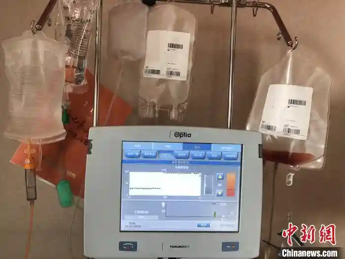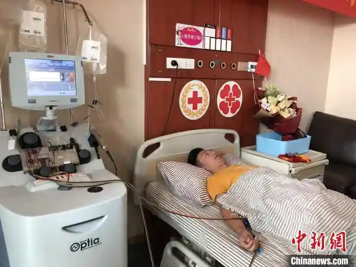 在浙江省中医院造血干细胞采集室内,26岁小伙毕昌林体内的血液沿着长长的采血管,进入一旁的血细胞分离器。历时3个多小时,11个循环之后,800毫升血液经分离提取留下240毫升造血干细胞,采集顺利完成。