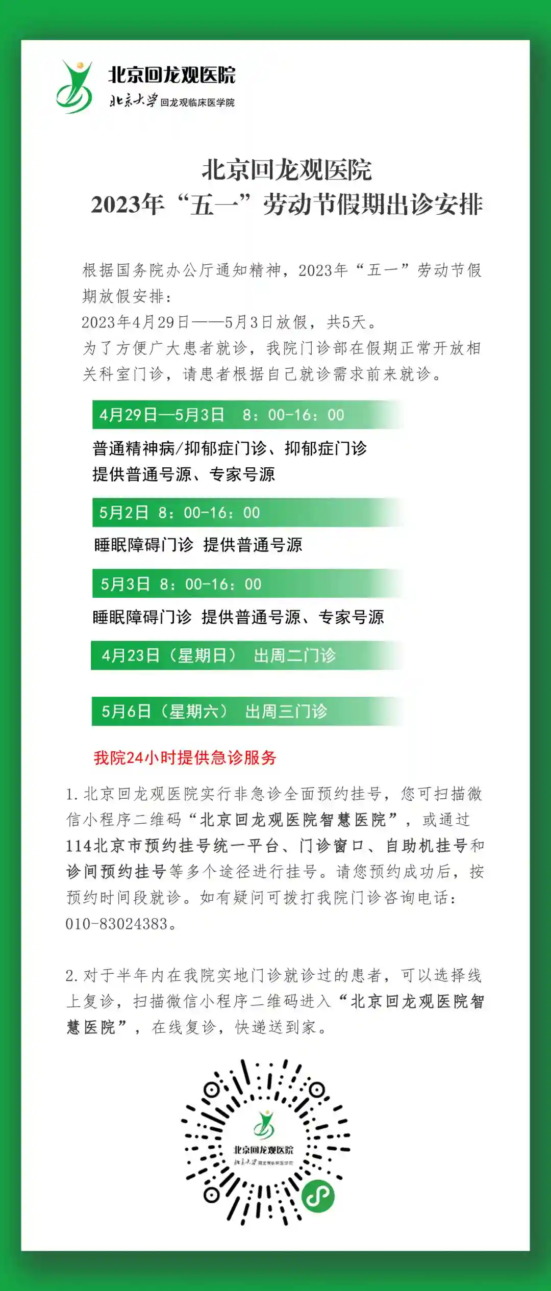 发热门诊、急诊科:4月29日至5月3日,24小时门诊。