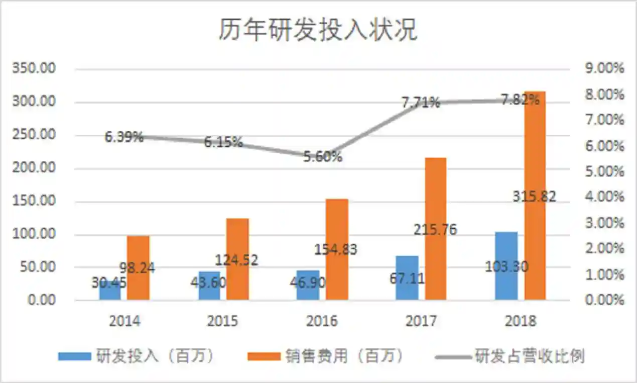 公司的研发投入水平在国内企业中属于中等水平,每年的研发投入增长较快。相较于销售费用而言,研发投入大概只有销售收入的三分之一。