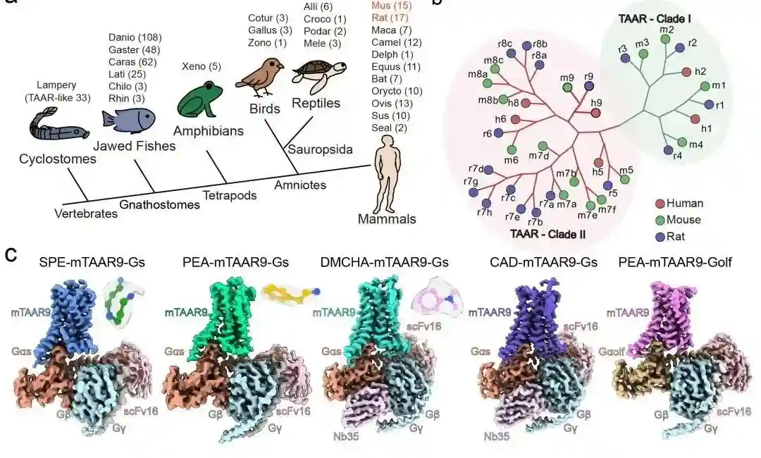 山东大学孙金鹏教授团队和上海交通大学医学院李乾研究员团队合作,应用冷冻电镜技术解析了TAAR家族成员之一的小鼠TAAR9(mTAAR9)受体在4种不同配体结合条件下与Gs/Golf(嗅觉特异性Gα)蛋白三聚体复合物的结构,进一步结合药理学分析揭示了mTAAR9感知配体后被激活的分子机制。同时,该研究也提出了嗅觉受体“组合编码”识别配体的结构机制,阐明了II类嗅觉受体独特的激活方式。