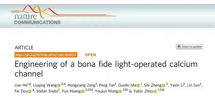 ZhouYubin教授实验室与王友军教授课题组联合美国德州农工大学HuangYun教授实验室再次合作,经过5年多的不懈努力,于近日共同在NatureCommunications杂志上发表文章,首次设计研发出一种蓝光精准调控并激活的具有高度选择性的钙离子通道LOCa(lightoperatedcalciumchannel)。LOCa是首个四次跨膜的光激活通道,这是在光遗传学领域的一个突破性的进展。研究团队在细胞及个体水平上应用该工具,在不同方面均展现了光开关的LOCa对CRAC相关疾病的治疗作用。