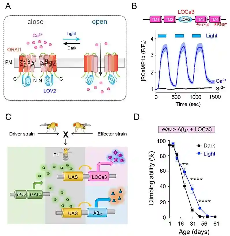 图1.LOCa3的光开关反应及在体应用。(A)设计示意图,(B)可逆光控钙信号,(C)AD-LOCa3果蝇设计示意图,(D)蓝光照射对AD果蝇攀爬能力的影响。