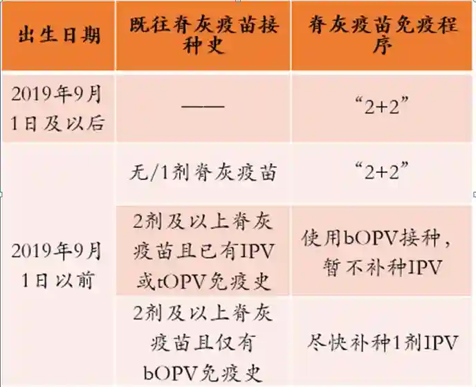 2019年9月1日以前出生的儿童,其中以前没有脊灰疫苗免疫史或只接种1剂脊灰疫苗的儿童,按照脊灰疫苗“2+2”免疫程序接种。