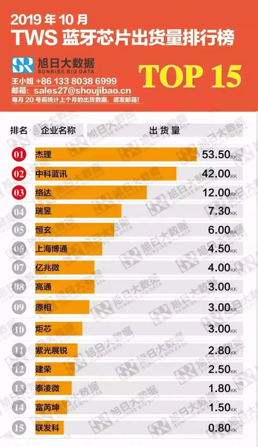 百花齐放除了苹果这个开阔者外,安卓阵营蓝牙耳机芯片市场也是白发齐放,美国方面高通技术最为成熟,也是目前市场最主流的TWS方案之一,博通,赛普拉斯(今年6月刚被英飞凌收购)都有入局;台湾方面,以络达(2017年并入联发科)为首的主控芯片设计商,络达在蓝牙音频市场上占比较大的,从成本和技术方面更能被大众所接受,今年已经出货十几亿颗蓝牙耳机芯片;此外广州安凯Anyka,珠海炬力,上海BK,珠海杰理,RDA,中科蓝讯等也身处混战。在旭日大数据统计的10月TWS蓝牙芯片出货量排行榜中,珠海杰理与中科蓝汛分列第一二位。