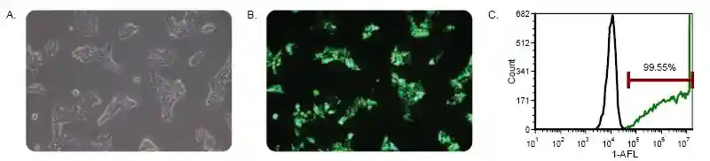OlympusIX71®倒置显微镜在10X镜下成像。图像为(A)相位对比,(B)绿色荧光。转染48小时后,细胞在Accuri®细胞仪上进行检测。直方图(C)显示了未转染的细胞(黑线)与使用TransIT-LT1质粒转染的细胞(绿线)。