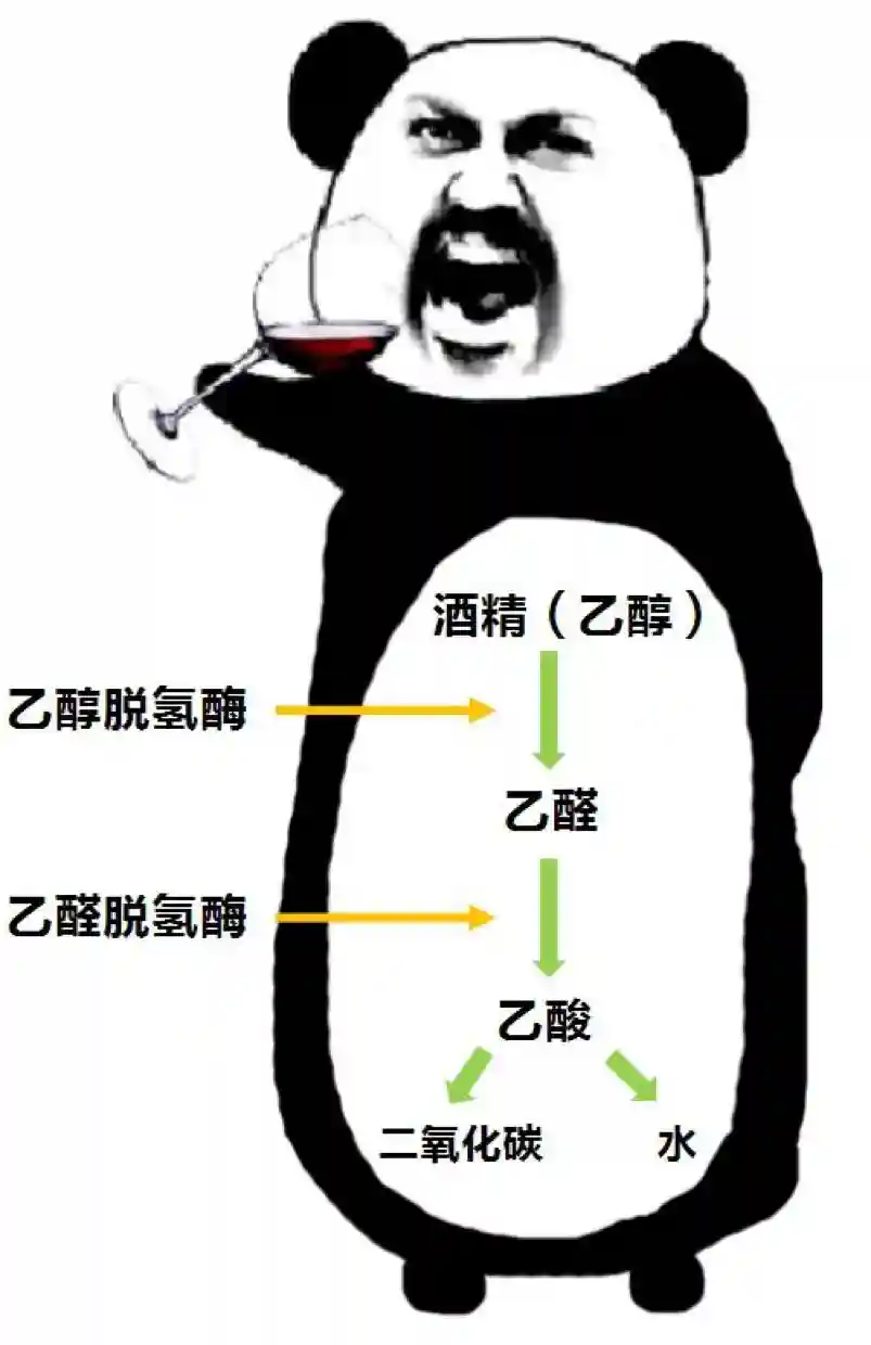 首先,不管你下肚的是茅台还是二锅头,喝酒的本质就是消化酒精。酒精在人体内的代谢是:酒精→乙醛→乙酸,酒精转化为乙醛需要乙醇脱氢酶,乙醛再转化为乙酸需要乙醛脱氢酶。乙醛不会让人醉酒,但是会毒害细胞,会提高患癌症的概率;乙酸对人体完全无害,可以快速排出体外。