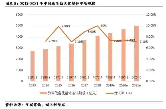 统计数据显示,2019年中国教育信息化整体市场规模预计突破4300亿元,未来两年持续增长但增速趋于稳定。未来,随着5G、AI、VR/AR等技术在教育领域的应用,新的硬件升级、覆盖于整个教学活动的软件服务以及C端用户的付费场景增加等,整个教育信息化市场将迎来一波新的高速增长机会点。