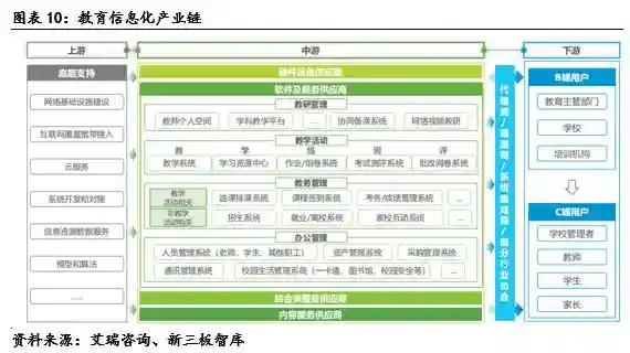 从产业链的角度分析,教育信息化的上游是电信运营商,中游是硬件、软件服务商及内容提供商,下游是B端和C端的终端用户。