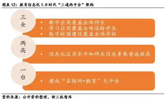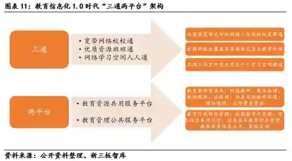 其中,“三通两平台”就被作为“十二五”期间教育信息化建设目标,即教育信息化1.0时代。“三通两平台”指“宽带网络校校通、优质资源班班通、网络学习空间人人通,建设教育资源公共服务平台和教育管理公共服务平台”。