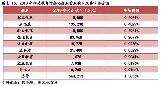 教育信息化行业尽管成长性良好,但并未形成具有绝对优势的龙头公司,整个行业集中度低、地域特征明显,未来行业中龙头公司的发展空间依旧巨大。统计显示,我国教育信息化企业数量有数千家,大多年营收规模低于3000万元,营收上亿规模的寥寥无几,其中上市/挂牌公司在教育信息化行业中的市场占有率也仅为5%左右。包括拓维信息、立思辰、科大讯飞、全通教育、方直科技、威科姆、分豆教育、能龙教育和星立方在内的主要K12教育信息化企业,2018年营业收入总计56.42亿元,仅占整个2018年我国教育信息化行业规模(4072.4亿元)很小的一部分,行业竞争格局呈现高度分散的特点。华腾作为其中领先的产品及服务提供商,成长空间巨大。