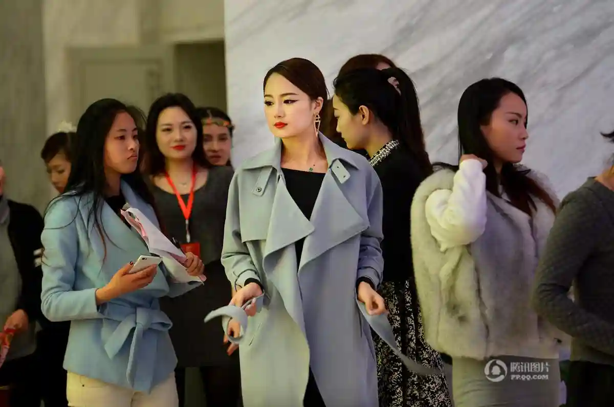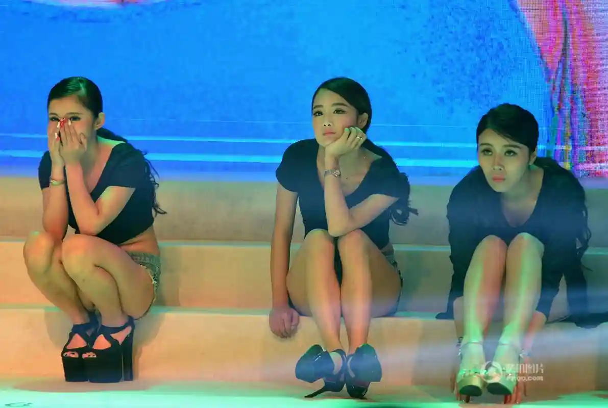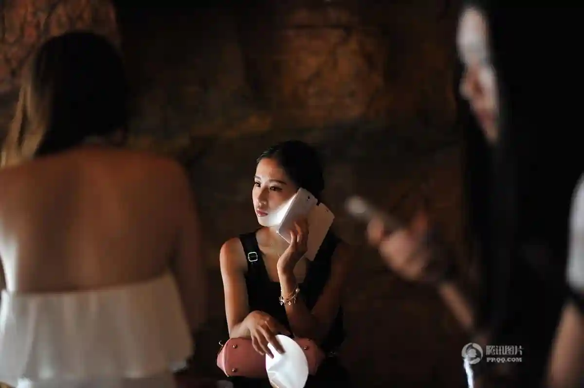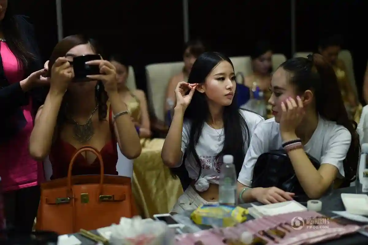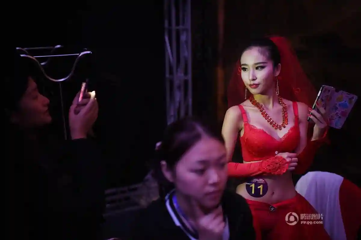 胸模大赛决赛,王琪和其他选手在候场,隆胸后,她的胸部挺拔了很多。