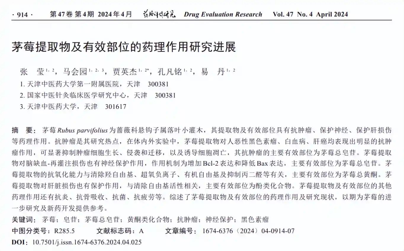 9结语中医药古籍对茅莓早有记载,名称有蛇泡簕、薅田藨、三月泡、红梅消等。茅莓的根、茎、叶含有黄酮类、二萜类、三萜及三萜皂苷类成分,总皂苷及黄酮类化合物是其主要的有效部位。茅莓提取物对皮肤肿瘤、白血病及肝癌细胞均具有增殖抑制作用,活性物质为茅莓总皂苷,茅莓总皂苷在体内的低毒性显示了良好的药物开发前景。茅莓对脑缺血-再灌注损伤具有神经保护作用,活性物质为其正丁醇萃取物茅莓总皂苷。